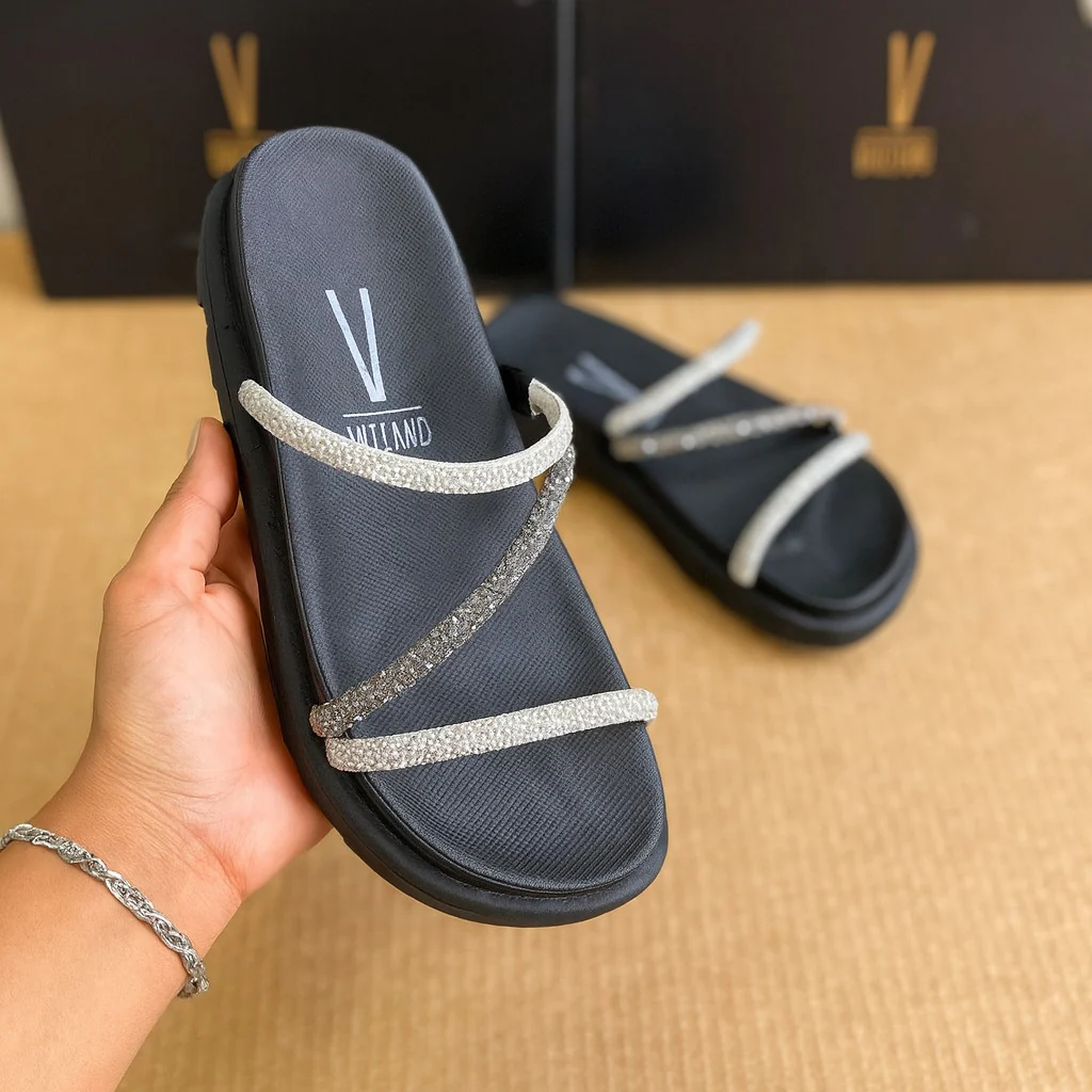 - Tiras com acabamento moderno e aplicação de strass brilhante